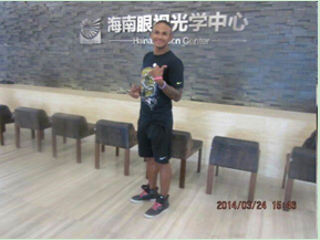 秦彪,32岁,JGO造型师,2006年在成都做过激光近视手术,当时5天看不清东西,戴了5天隐形眼镜,而且疼痛,术后仍有几百度近视。2015年5月12日,到我们海南眼视光学中心进行修复手术,从进手术室到出来5分钟而已,术后不用戴眼罩、也不用戴隐形眼镜,眼睛不红也不痛,图为秦先生刚从手术室出来的留影。(世界各地曾做过RK、PRK、LASIK、EK等各种屈光手术,视力不好的患者,均可来我中心行修复手术,术后立即获得完美的视力,不用戴眼罩且视力不会再回退。)