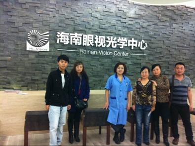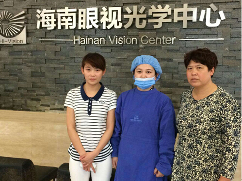 内蒙古陆春明,46岁,1800度近视及散光(1500近视加300散光),而且角膜厚度很薄(只有486微米),任何一家医院都做不了这个高难度近视激光手术。2015年3月13日,她和女儿慕名专程从内蒙古飞抵海口,母女俩同时在我中心做了完美的飞秒激光近视手术。图为母女俩刚从手术室做完手术出来的留影,随后便坐高铁去三亚游玩了。(我中心是世界范围内唯一做其他医院不能做的超高度近视、超高散光、高度远视、超薄角膜等高难度激光手术的中心,也是唯一术后不用戴眼罩,立即可以用眼的中心)
