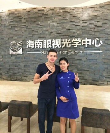 俄罗斯Sergly Yatsenko先生,32岁,600多度近视,角膜超薄(486微米),去过很多医院都不能帮他做激光近视手术。2015年8月25日,他慕名专程飞抵海口,在我中心接受了最完美的激光近视手术。图片为Sergly Yatsenko先生从手术出来,愉快的与中心前台工作人员合影留念。(我中心享誉中外,世界各地不能治疗的超高度近视、高度散光、高度远视、超薄角膜等高难度屈光手术患者,常常慕名专程前来我中心接受完美的激光手术,也时常有世界各地的屈光不正患者专程前来验配正确度数的眼镜)